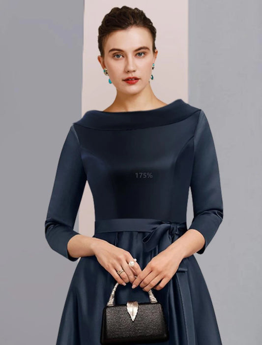 A-Line Mother of the Bride Dress Formal Wedding Guest Elegant High Low Bateau Neck Asymmetrical Ankle Length Satin 3/4 Length Sleeve with Bow(s) Pleats