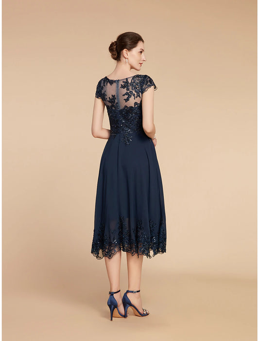 A-Line Mother of the Bride Dress Wedding Guest Plus Size Elegant Jewel Neck Tea Length Chiffon Lace Half Sleeve with Ruched Beading Appliques Fall
