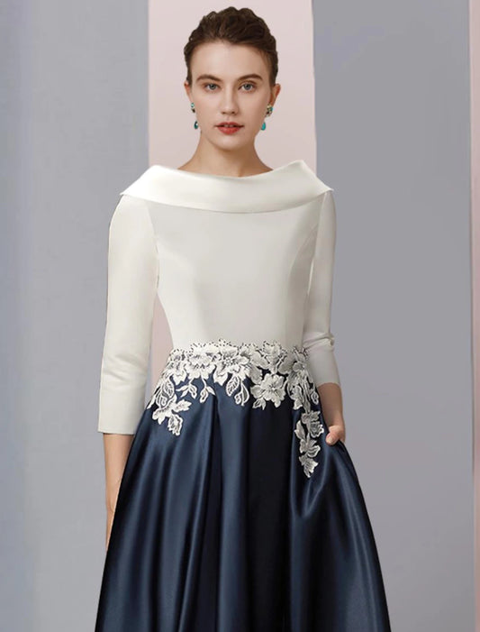 A-Line Mother of the Bride Dress Formal Wedding Guest Elegant Vintage Bateau Neck Tea Length Satin Lace Half Sleeve with Pleats Appliques Color Block