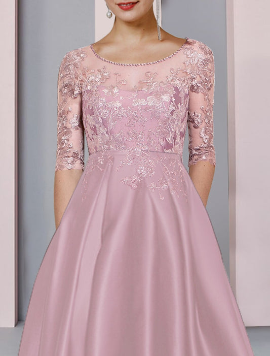 A-Line Mother of the Bride Dress Formal Wedding Guest Party Elegant High Low Scoop Neck Asymmetrical Tea Length Satin Lace Half Sleeve with Pleats Beading Appliques
