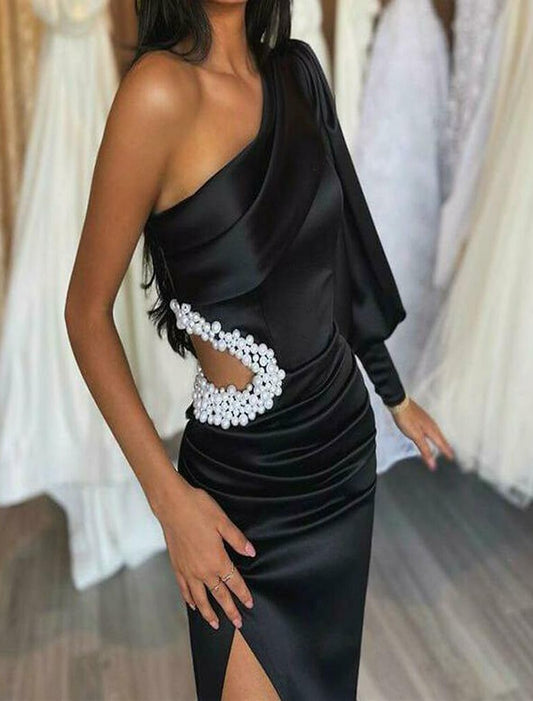 Mermaid Evening Gown Black Dress One Shoulder Satin Dress Formal Masquerade Halloween Floor Length Long Sleeve with Rhinestone