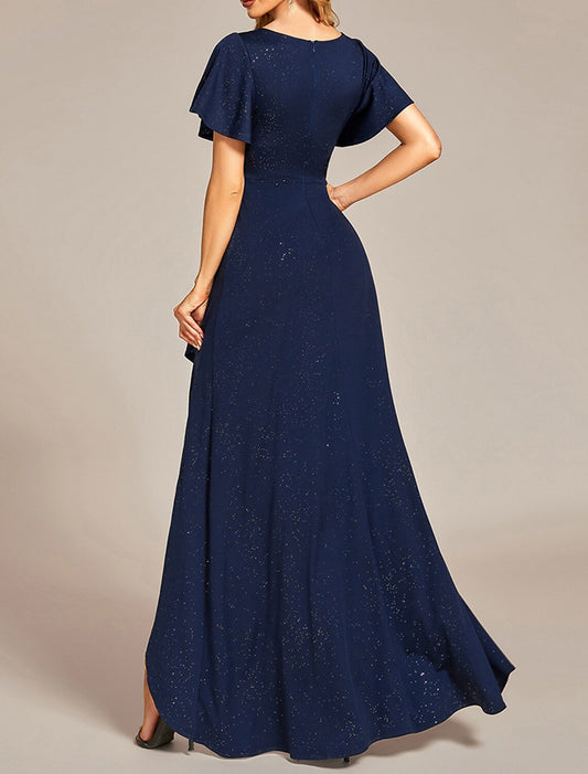 A-Line Wedding Guest Dresses Glittering Dress Party Wear Prom Sweep / Brush Train Short Sleeve V Neck Polyester with Glitter Slit