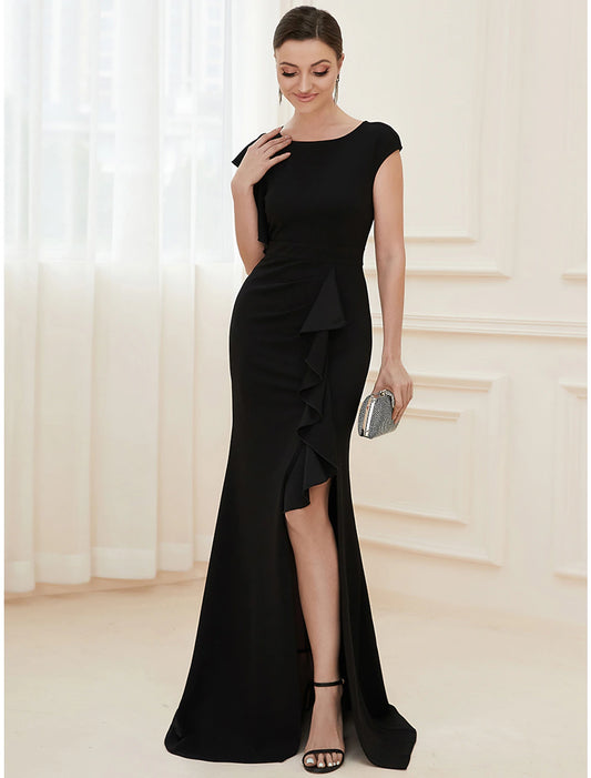 Mermaid / Trumpet Evening Gown Vintage Dress Formal Wedding Guest Floor Length Short Sleeve Jewel Neck Nylon with Ruffles Slit