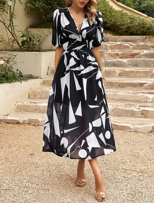 A-Line Wedding Guest Dresses Floral Dress Holiday Summer Tea Length Short Sleeve V Neck Chiffon with Print