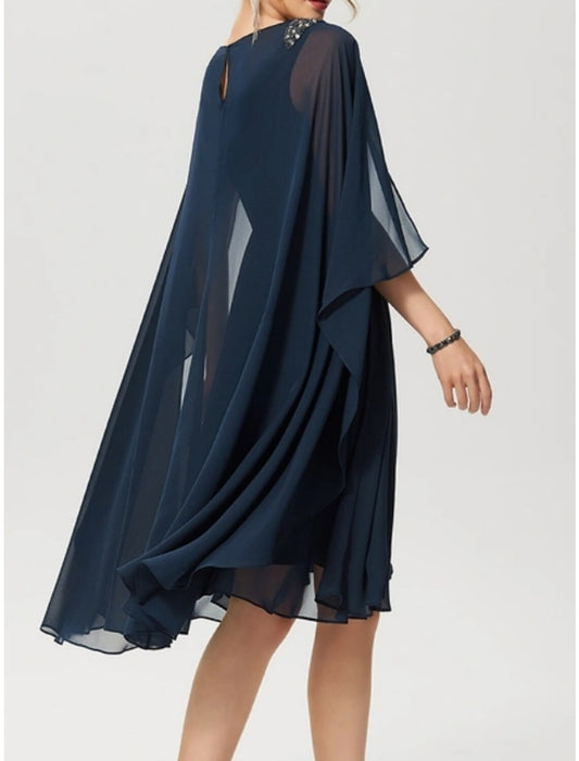 A-Line Wedding Guest Dresses Elegant Cape Dress Formal Fall Knee Length Sleeveless V Neck Chiffon with Pleats Ruched Crystals
