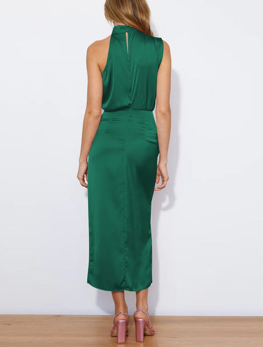 A-Line Wedding Guest Dresses Elegant Dress Party Wear Semi Formal Tea Length Sleeveless High Neck Stretch Satin with Slit