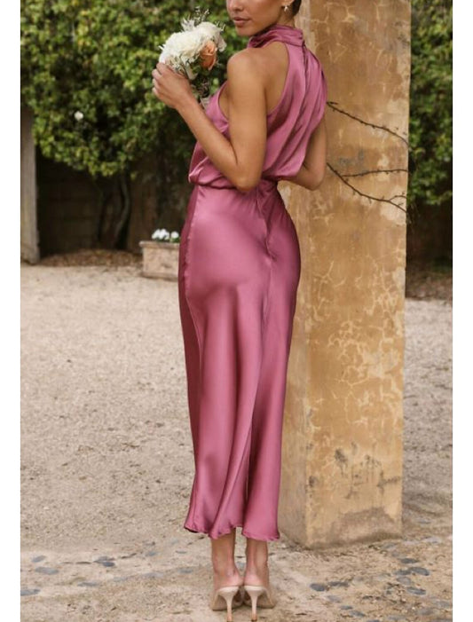 A-Line Wedding Guest Dresses Corsets Dress Wedding Birthday Ankle Length Sleeveless Halter Neck Satin with Ruched