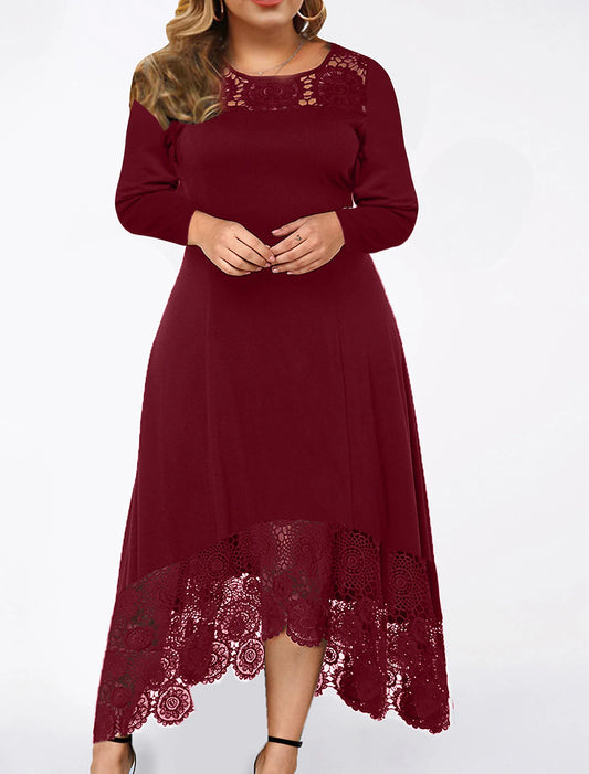 A-Line Cocktail Dresses Plus Size Dress Party Wear Wedding Guest Ankle Length Long Sleeve Jewel Neck Spandex with Lace Insert Pure Color