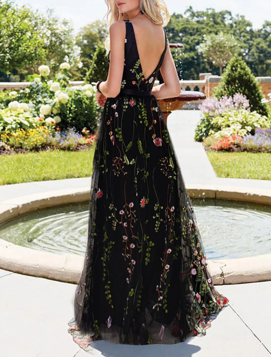 A-Line Prom Dresses Floral Dress Wedding Guest Party Wear Tea Length Sleeveless V Neck Lace with Embroidery Appliques