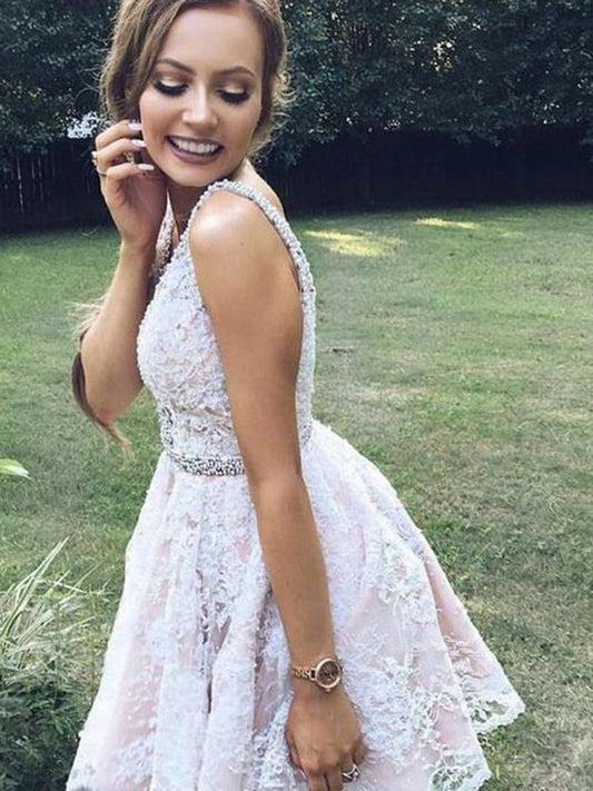 A-Line/Princess Lace V-Neck Sleeveless Satin Short/Mini Dresses