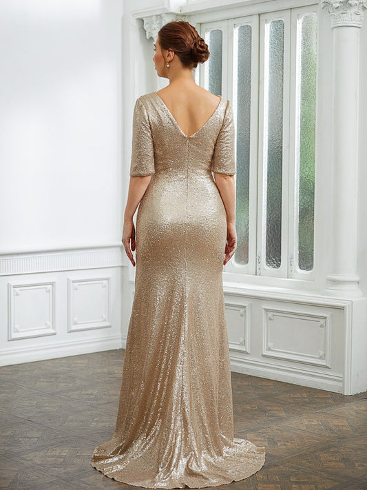 Sheath/Column Sequins Ruched 1/2 Sleeves Sweep/Brush Train Mother of the Bride Dresses