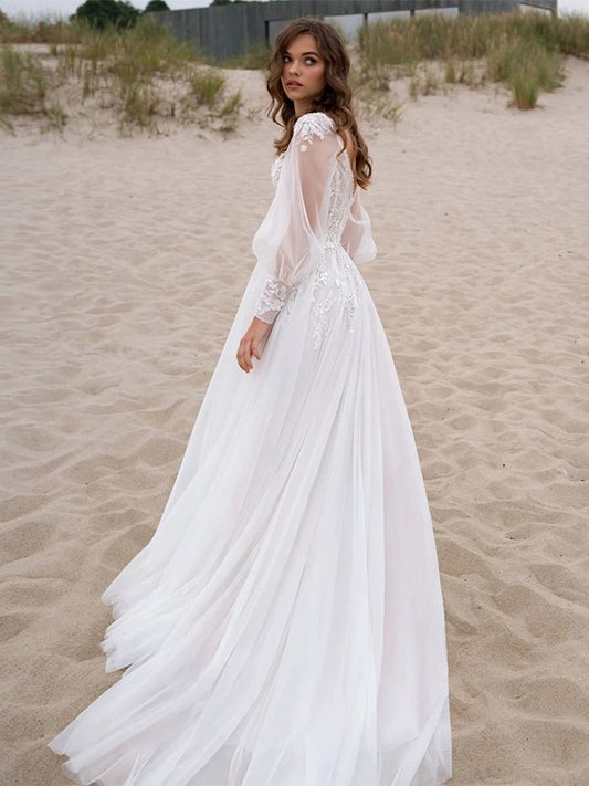 A-Line/Princess Lace Applique V-neck Long Sleeves Sweep/Brush Train Wedding Dresses
