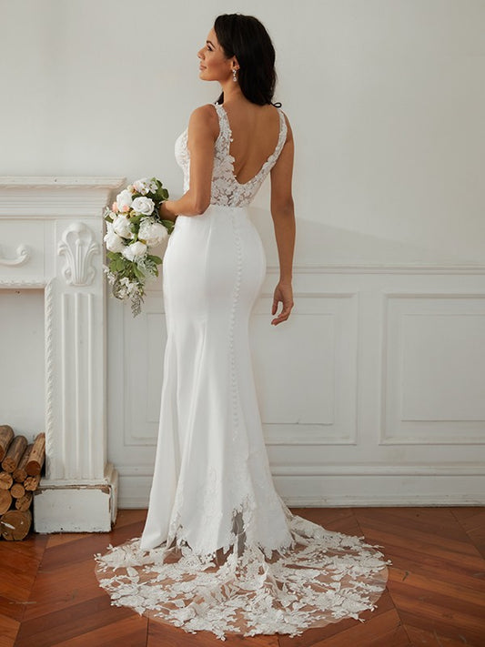Sheath/Column Charmeuse Lace V-neck Sleeveless Court Train Wedding Dresses