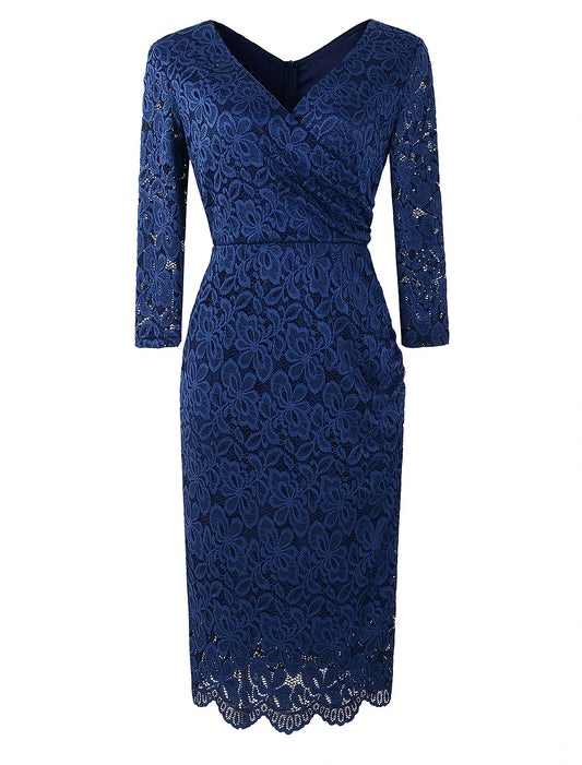 Sheath / Column Cocktail Dresses Vintage Dress Party Wear Wedding Guest Knee Length 3/4 Length Sleeve V Neck Fall Wedding Guest Lace with Lace Insert