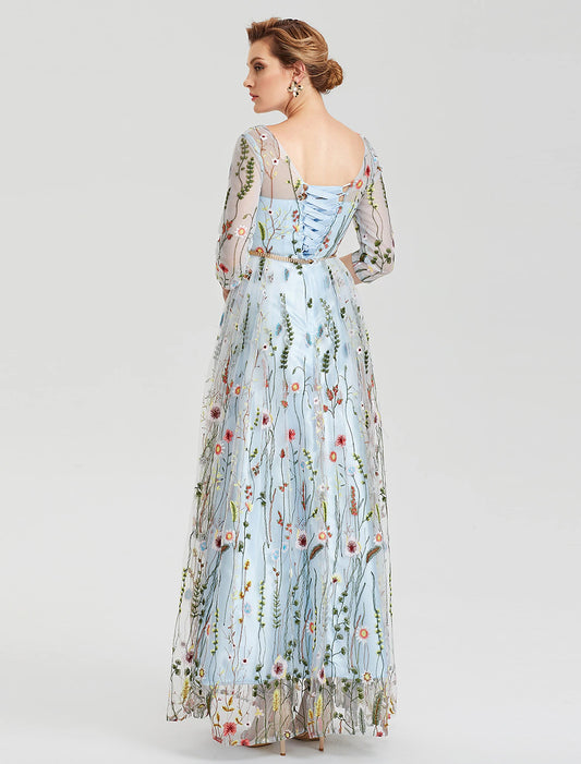 A-Line Empire Dress Party Wear Wedding Guest Floor Length 3/4 Length Sleeve Illusion Neck Lace with Embroidery Appliques
