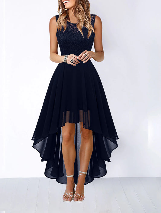 A-Line Cocktail Dresses Vintage Dress Party Wear Wedding Guest Asymmetrical Sleeveless Jewel Neck Chiffon with Pleats Lace Insert Pure Color