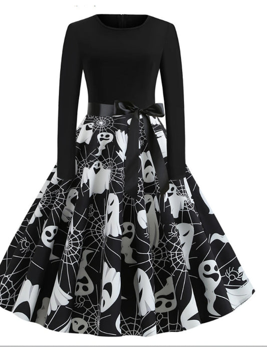 A-Line Party Dresses Vintage Dress Halloween Knee Length Long Sleeve Jewel Neck Polyester with Bow(s) Print