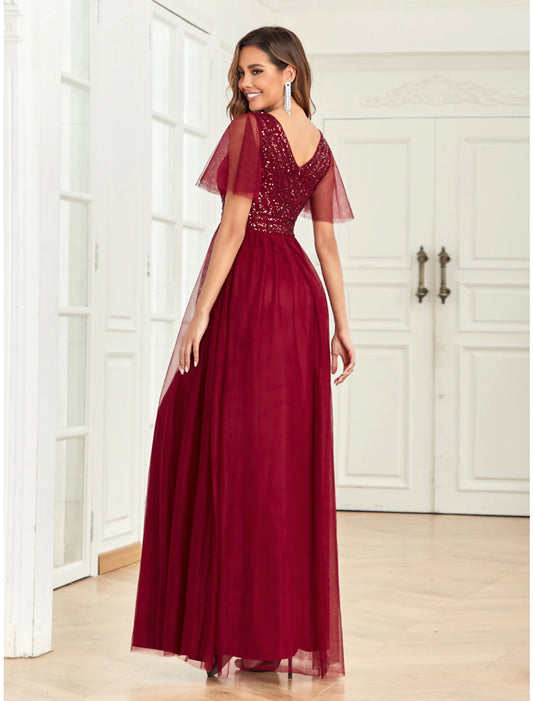 A-Line Party Dresses Empire Dress Party Wear Wedding Reception Floor Length Short Sleeve V Neck Tulle V Back with Glitter Sequin