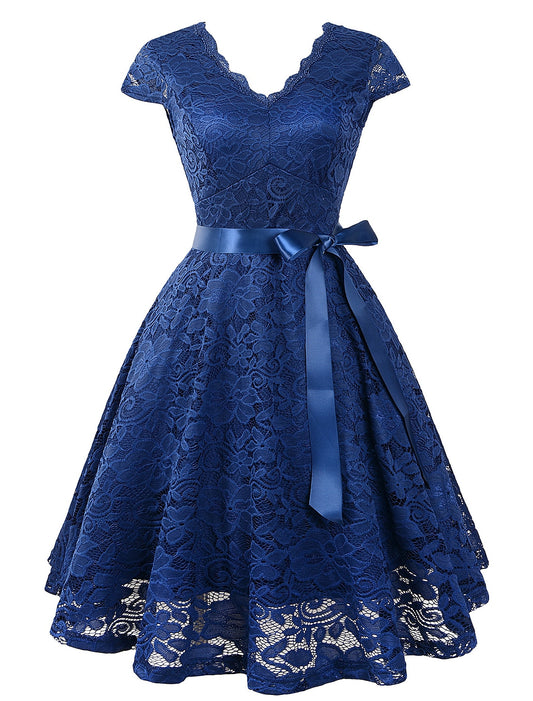 A-Line Cocktail Dresses Vintage Dress Wedding Guest Graduation Knee Length Short Sleeve V Neck Lace V Back with Sash / Ribbon Pleats