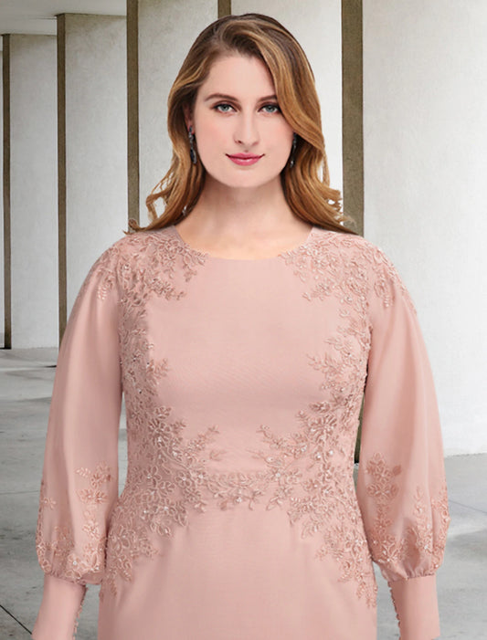 Sheath / Column Plus Size Curve Mother of the Bride Dresses Elegant Dress Formal Tea Length Long Sleeve Jewel Neck Chiffon with Appliques