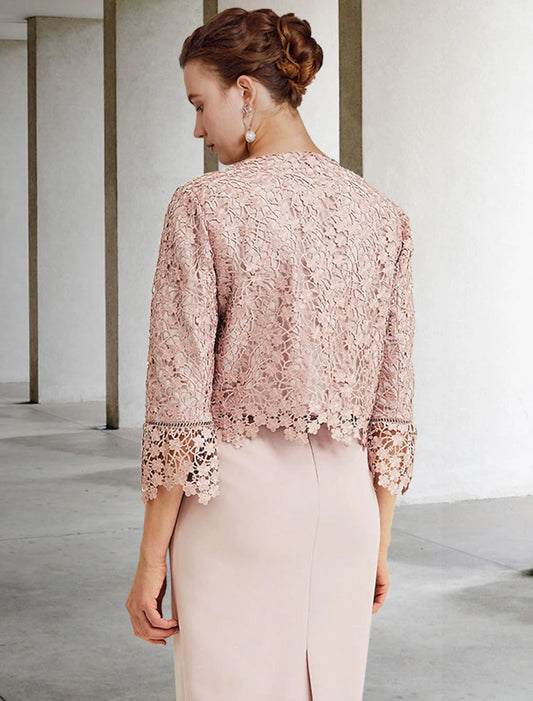 Two Piece Sheath / Column Mother of the Bride Dress Formal Wedding Guest Elegant Scoop Neck Knee Length Chiffon Lace 3/4 Length Sleeve with Bow(s)