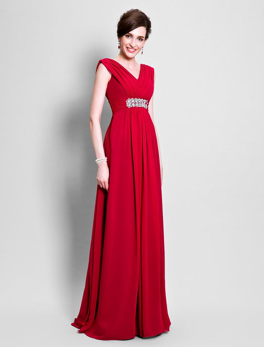 A-Line Mother of the Bride Dress V Neck Floor Length Chiffon Sleeveless with Beading Side Draping