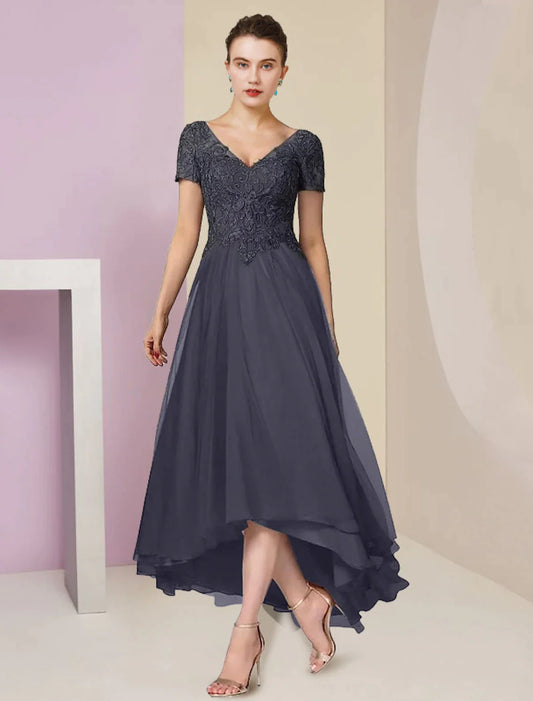 Two Piece A-Line Mother of the Bride Dress Formal Wedding Guest Elegant High Low V Neck Asymmetrical Tea Length Chiffon Lace Short Sleeve Wrap Included with Appliques
