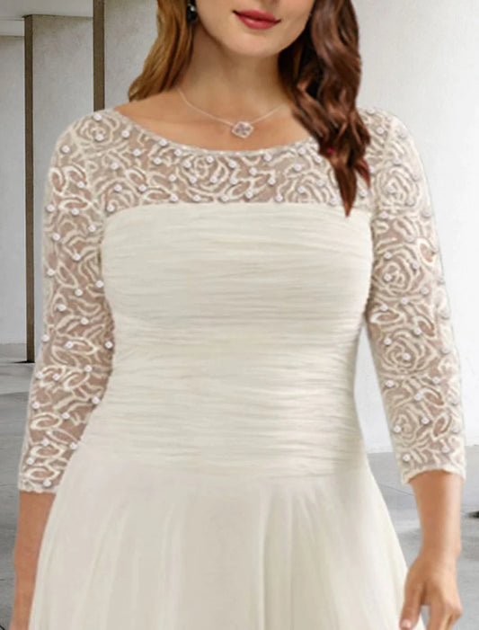 A-Line Plus Size Curve Mother of the Bride Dresses Elegant Dress Formal Tea Length 3/4 Length Sleeve Jewel Neck Chiffon with Ruched Beading Sequin