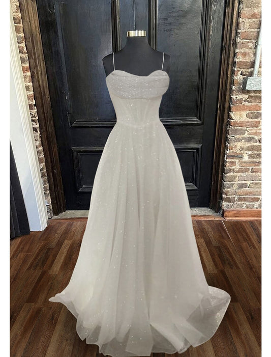 A-Line Prom Dresses Corsets Dress Wedding Party Sweep / Brush Train Sleeveless Spaghetti Strap Tulle with Glitter Pleats