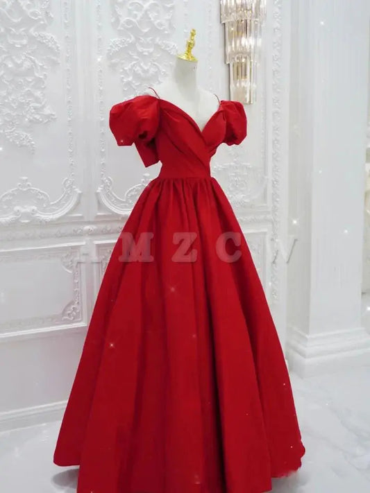 Amzcw Simple red v neck satin long prom dress red evening dress formal wear dresses