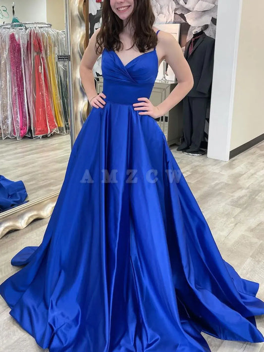 Amzcw Simple blue v neck satin long prom dress blue formal dress formal wear dresses