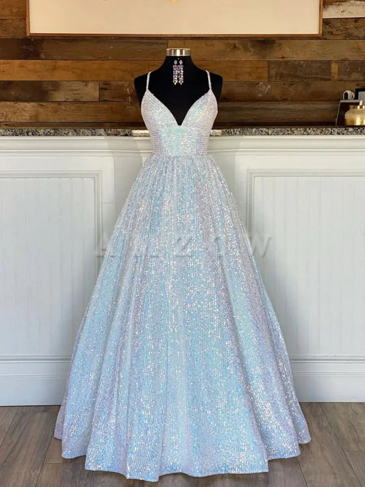 Amzcw Simple v neck sequin long prom dress sequin evening dress formal wear dresses