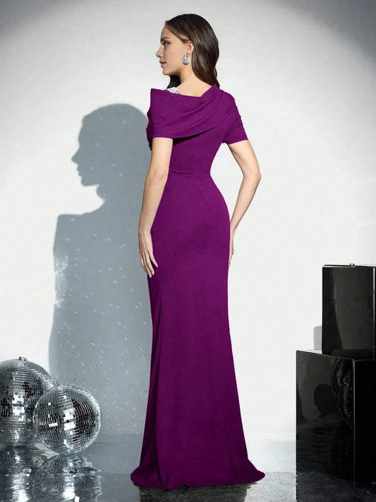 Elegant Plum Purple One-Shoulder Off-The-Shoulder Beaded Short Sleeve Ruched Mermaid Formal Gown Prom Dress