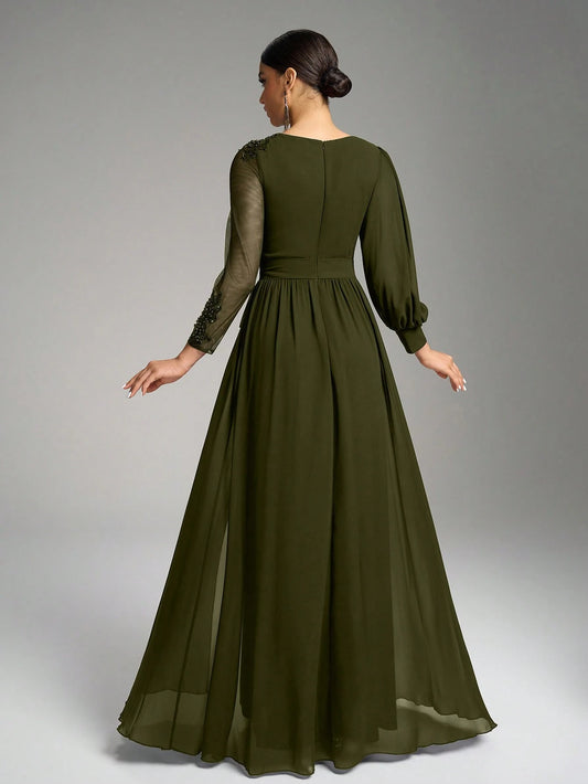 Elegant Sheath/Column High-Neck Long-Sleeve Embellished Chiffon Maxi Dress Prom Dress