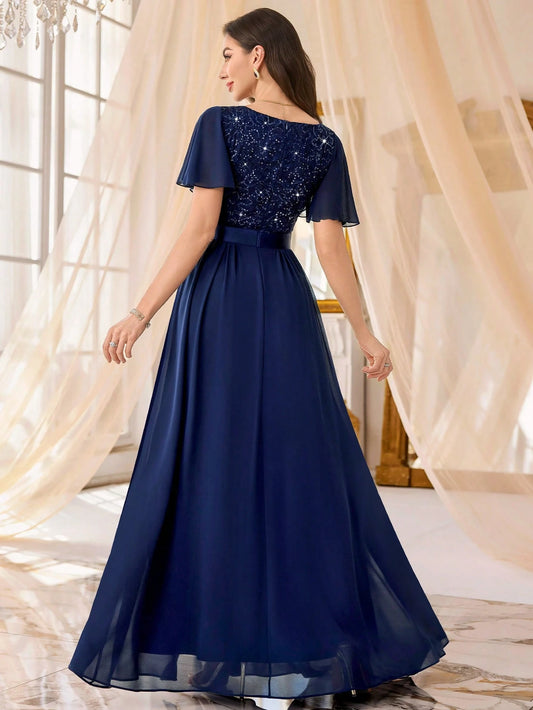 Elegant Navy Blue V-Neck Flutter Short Sleeve Sequin-Embellished Chiffon Floor-Length Formal Maxi Dress Prom Dress