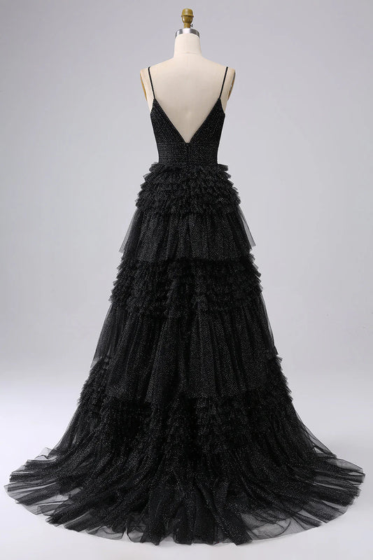 Amzcw Black A Line Spaghetti Straps Long Tulle Prom Dress with Ruffles prom dresses shops