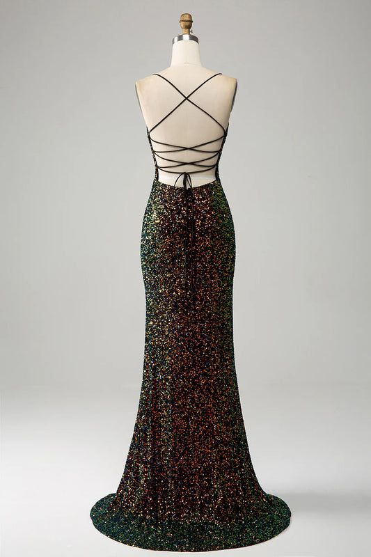 Amzcw Black Mermaid Spaghetti Straps Sparkly Sequins Long Prom Dress with Slit prom dresses shops