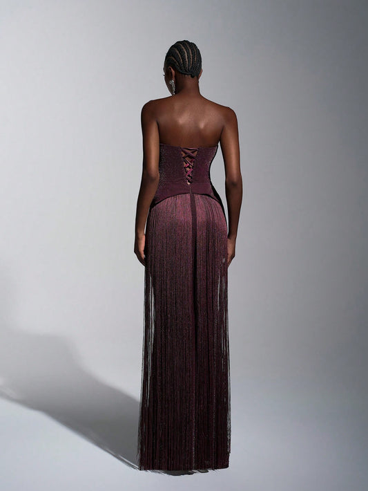 Elegant Sheath/Column Strapless Sleeveless Open Back Fringe Corset Floor-Length Maxi Dress Prom Dress