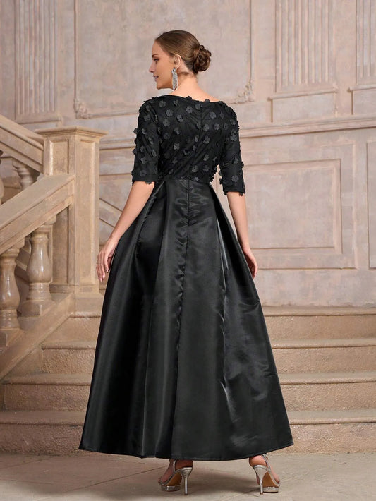 Elegant A-Line/Princess 3/4 Sleeve Floral Embellished Satin Ball Gown Maxi Dress Prom Dress