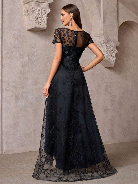 Elegant A-Line/Princess Short Sleeve Sheer Embroidered High-Low Maxi Dress Prom Dress