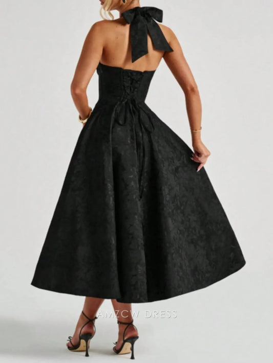 Elegant Halter Neck Deep V Lace-Up Back Brocade Midi Ballgown Prom Dress