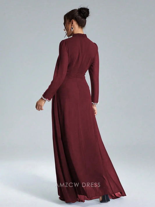 Elegant High Neck Long Sleeve Ruched Chiffon Maxi Dress with Pearl Cuffs Prom Dress