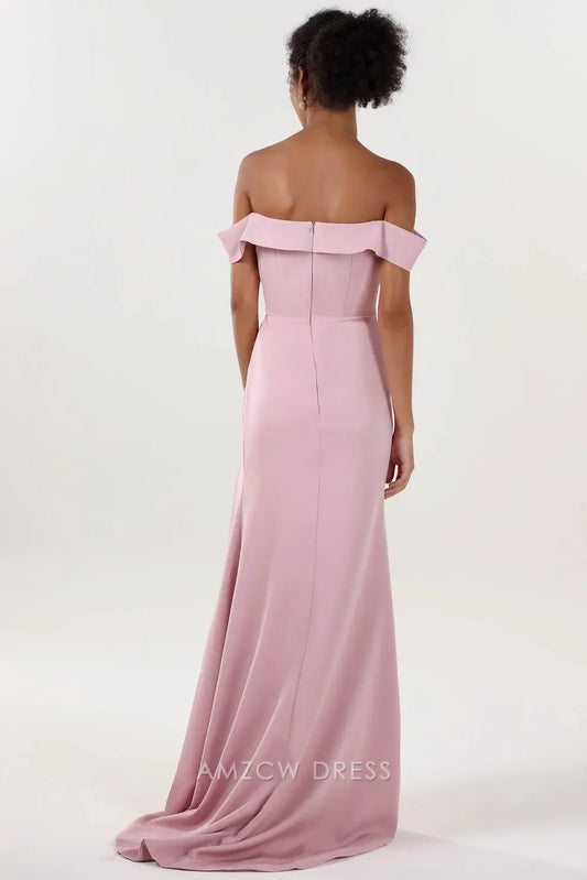 Elegant Off-Shoulder Ruched Satin Mermaid Maxi Dress with Train Prom Dress