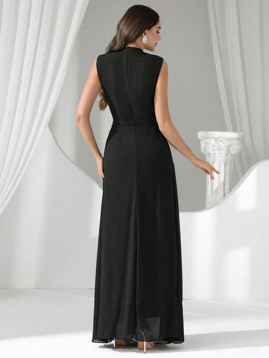 Elegant Sleeveless Embellished Mock Neck Ruched Chiffon Maxi Dress Prom Dress