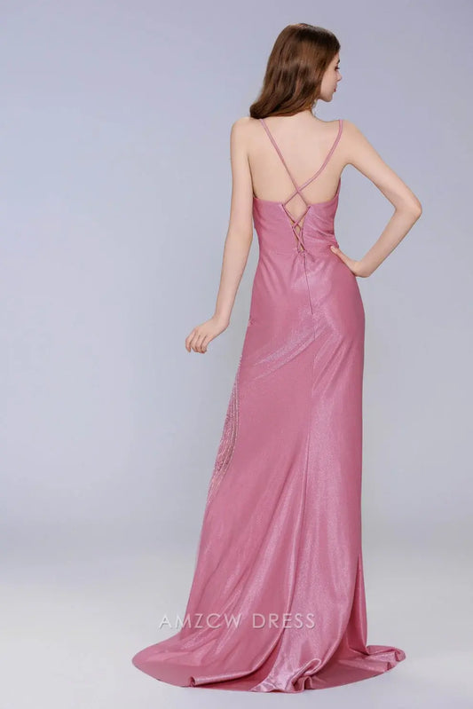 Elegant Spaghetti Strap Beaded Slit Maxi Dress with Crisscross Back Prom Dress
