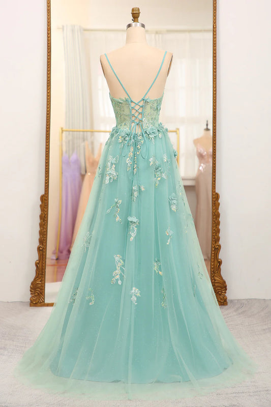 Amzcw Green A-Line Spaghetti Straps Long Sparkly Prom Dress With Appliques prom dresses shops