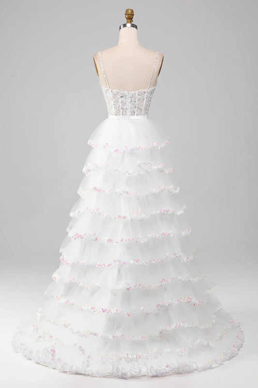 Amzcw White A-Line Sparkly Sequins Long Corset Prom Dress With Slit prom clothing