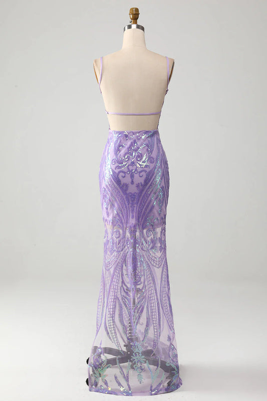 Amzcw Light Purple Spaghetti Straps Sparkly Sequin Backless Prom Dress prom clothing
