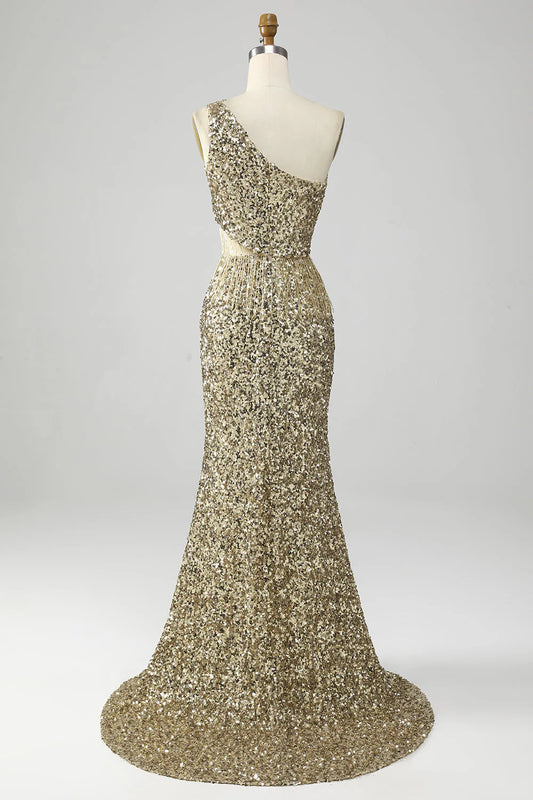 Amzcw Golden Mermaid One Shoulder Fringe Sequin Prom Dress With Slit prom dresses with long sleeves