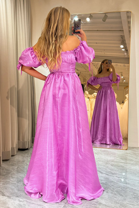 Amzcw A-Line Off The Shoulder Fuchsia Lace-Up Prom Dress With Puff Sleeves prom dresses with long sleeves